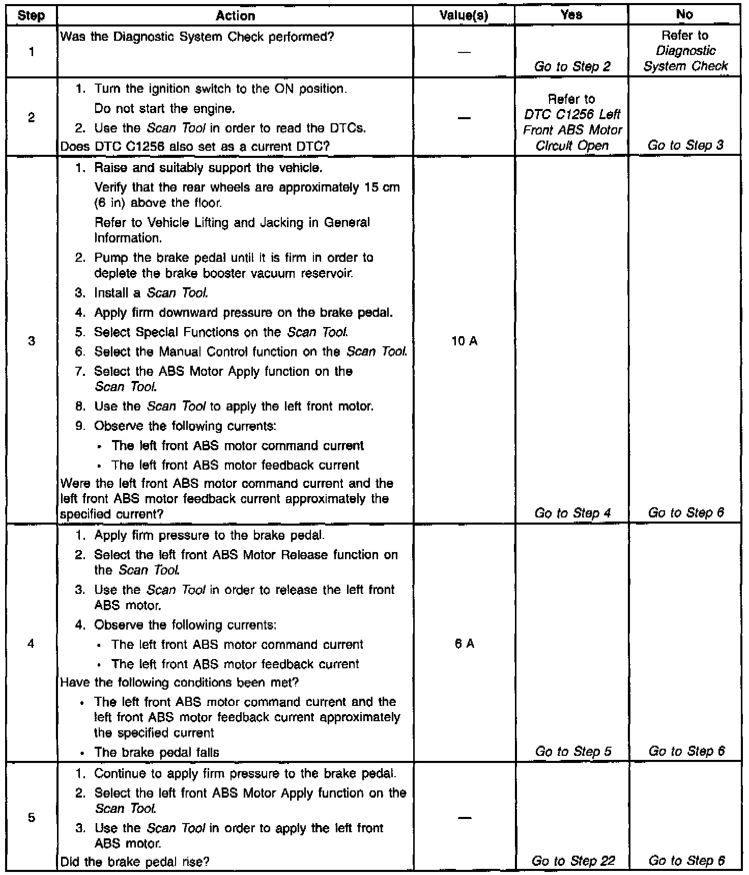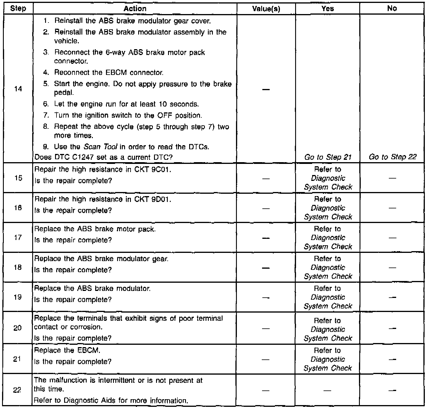 Use the enhanced diagnostic function of the Scan Tool in order to measure the frequency of the malfunction. DTC C1247 may set after modulator disassembly if the modulator pistons are positioned at the bottom of the modulator piston bore. If DTC C1247 only occurs once and DTC C1256 also occurs, refer to DTC C1256. If intermittent and enhanced diagnostics shows this DTC occurs during ABS, refer to DTC C1256.