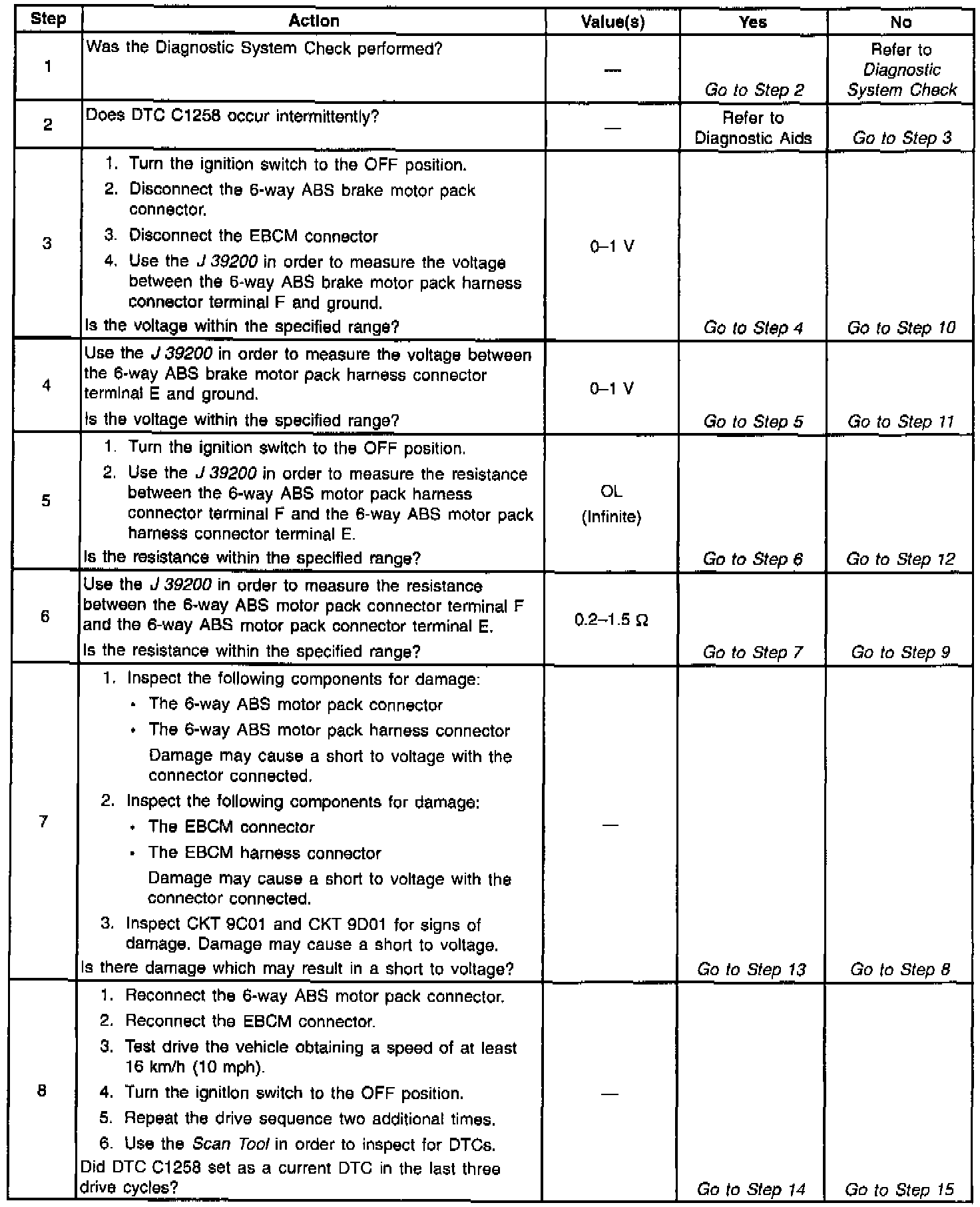 Diagnostic Trouble Code (DTC) C1258 identifies an Antilock Brake System (ABS) motor circuit that shorts to voltage or an ABS motor that has low or no resistance. A short to voltage will not allow controlled ABS operation.