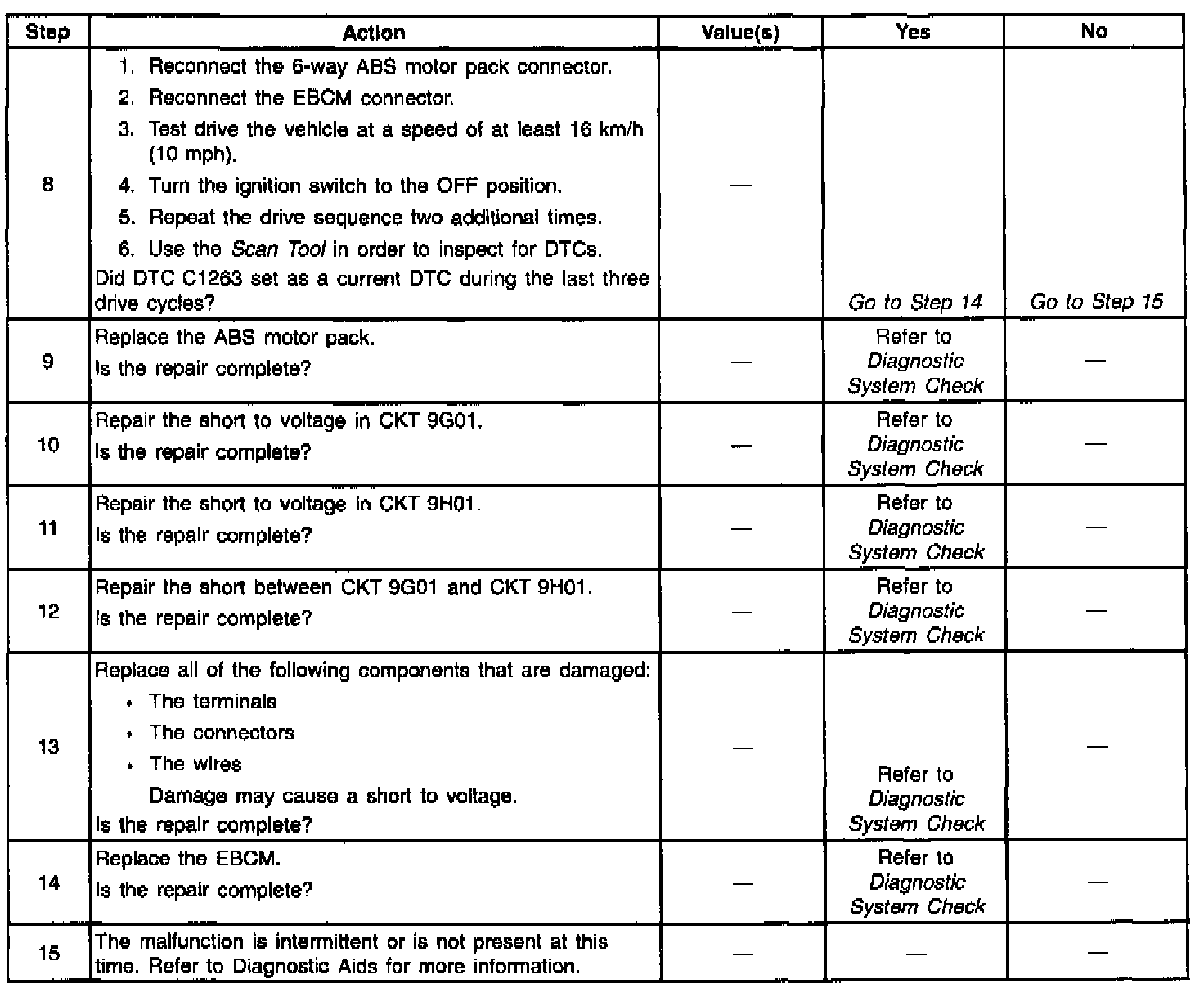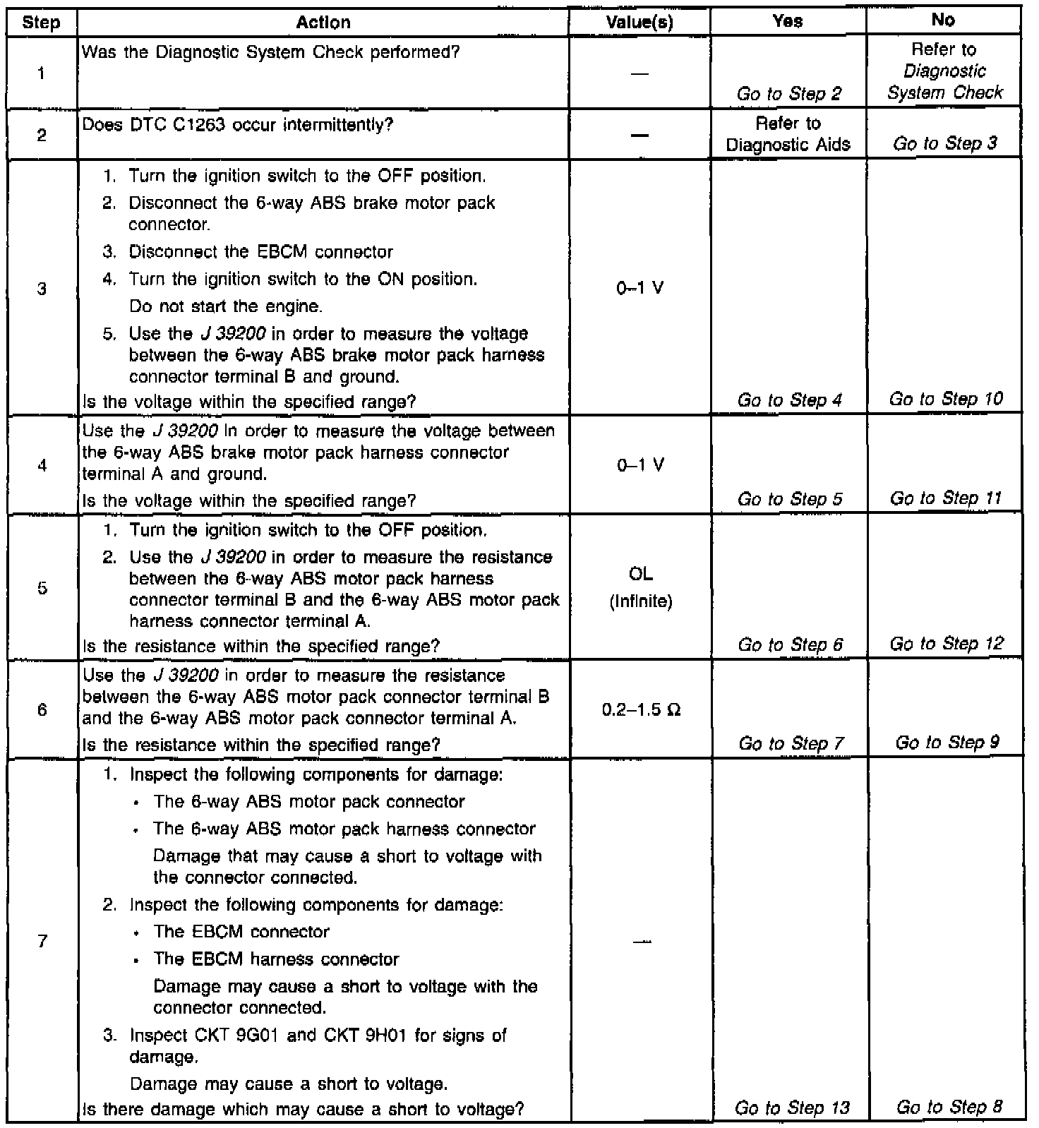 Diagnostic Trouble Code (DTC) C1263 identifies an Antilock Brake System (ABS) motor circuit that is shorted shorts to voltage or an ABS motor that has low or no resistance.