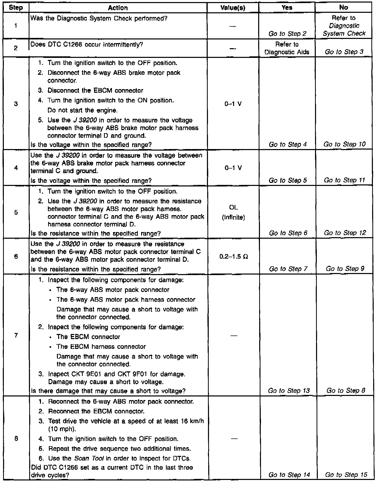 Diagnostic Trouble Code (DTC) C1266 identifies an Antilock Brake System (ABS) motor circuit that shorts to voltage or an ABS motor that has low or zero resistance. The malfunction will cause one of the following conditions to occur: