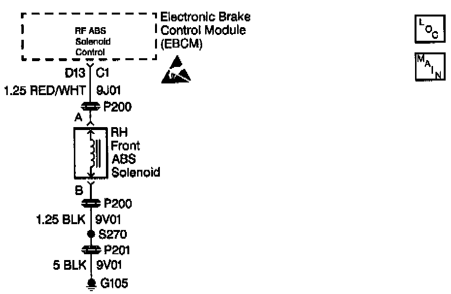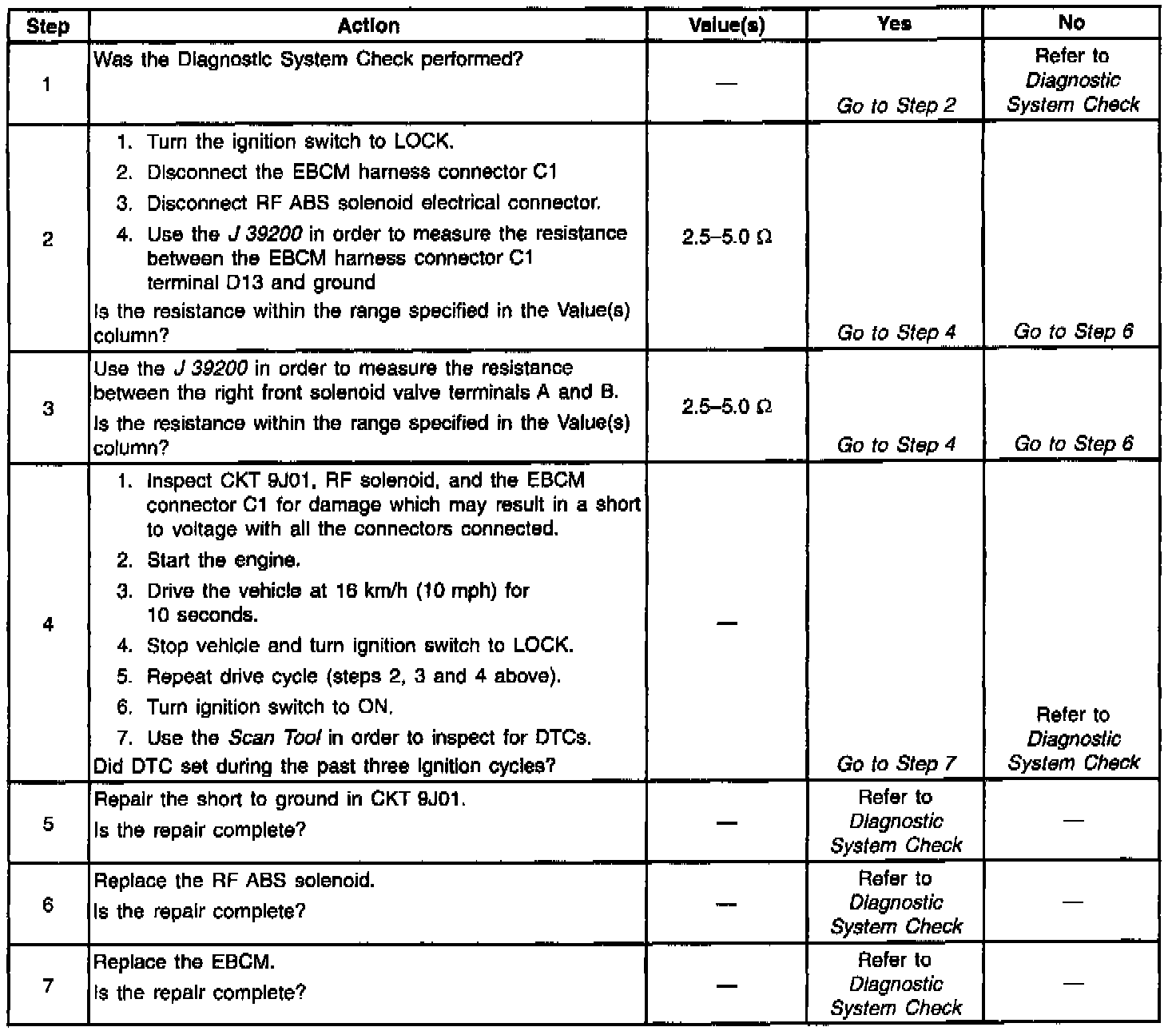- The Electronic Brake Control Module (EBCM) identifies a situation in which the right front solenoid cannot be turned ON due to a ground in Circuit (CKT) 9J01.
