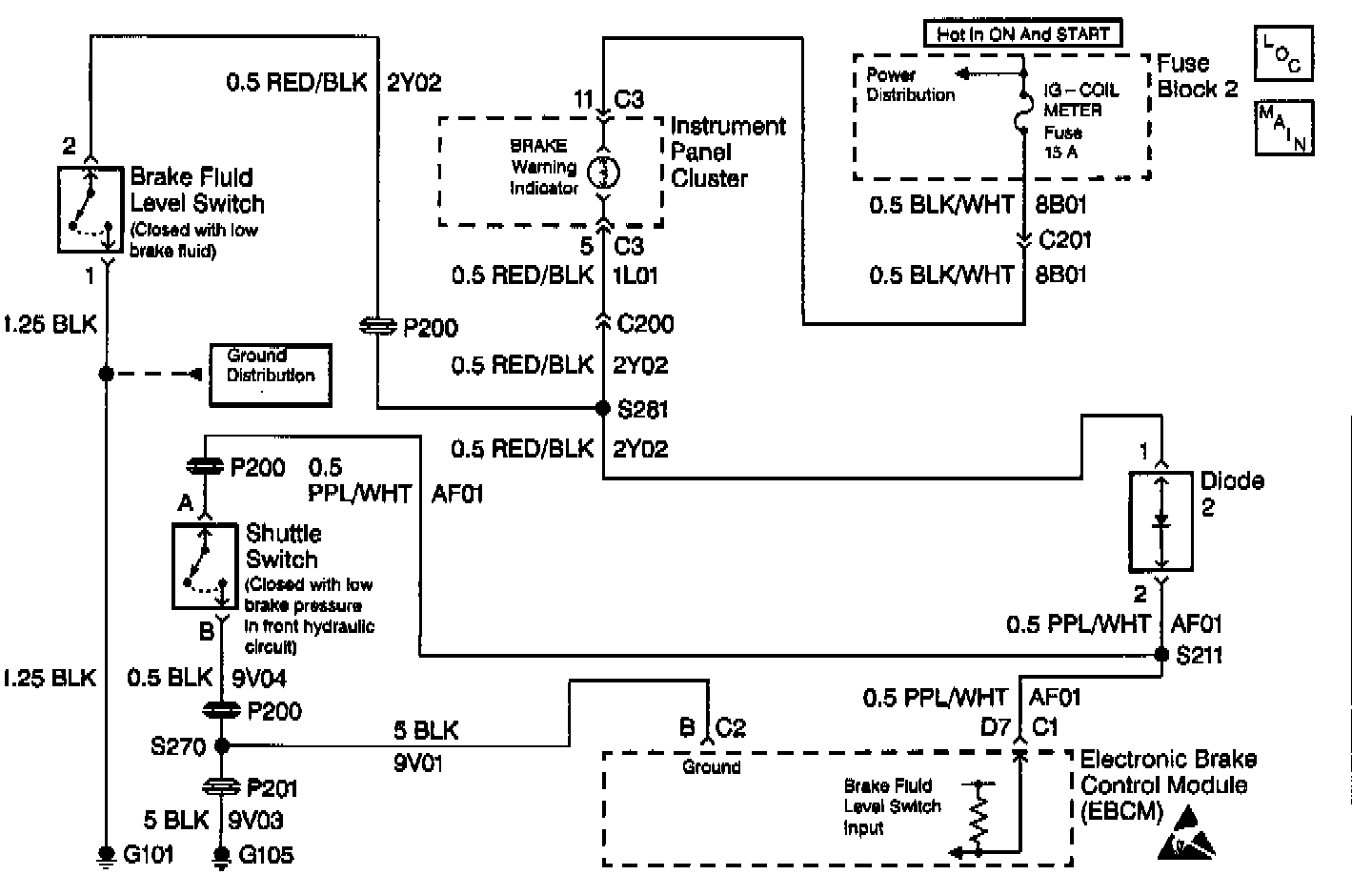 - The EBCM detects battery voltage on the red BRAKE warning lamp control circuit (Circuit (CKT) AF01 and/or 2Y02).