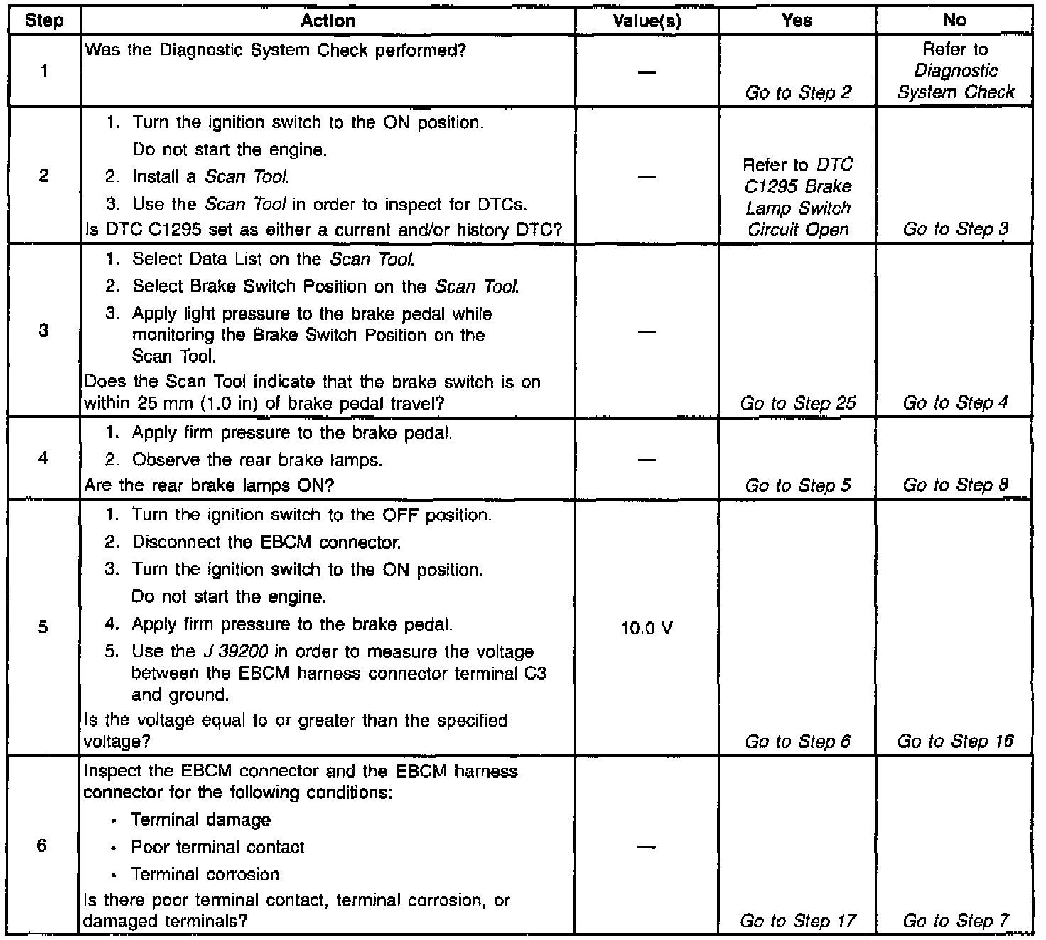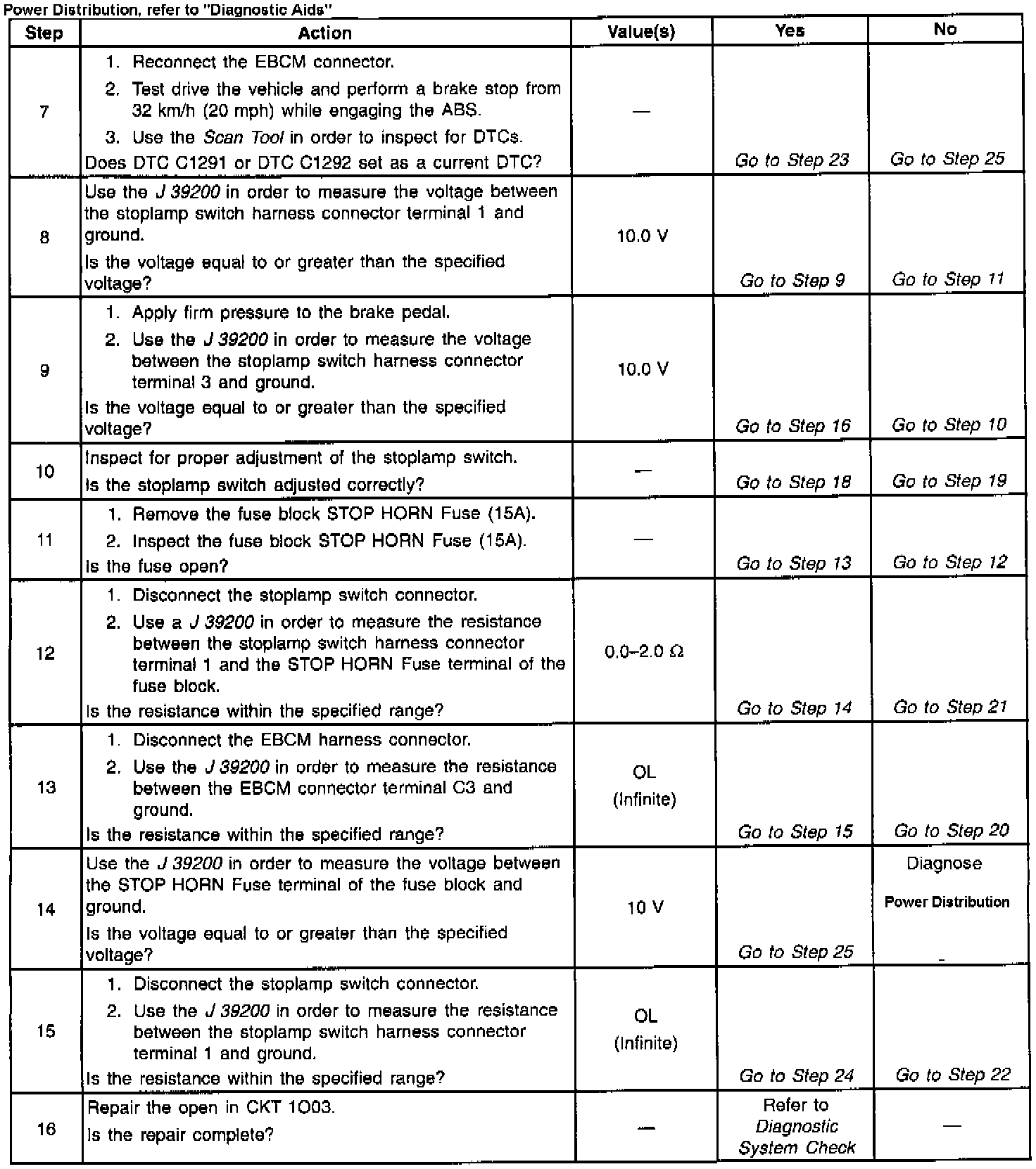 Diagnostic Trouble Code (DTC) C1292 determines the proper operation of the brake switch. Proper operation of the brake switch is important because the brake switch activates the Antilock Brake System (ABS) when the brake switch is on. If the brake switch is off, the ABS will never activate. This malfunction is only detected when ABS is required because it is difficult to detect the malfunction under normal braking conditions.