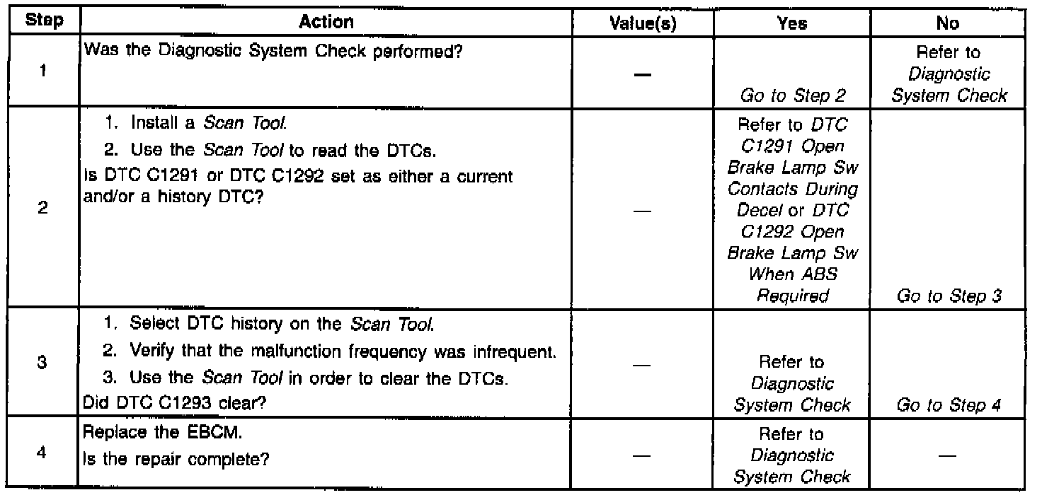 - When a change is seen during an ignition cycle in which DTC C1293 is a current malfunction, DTC C1291 or C1292 will clear itself at the end of the current ignition cycle and ABS will enable itself at the start of the next ignition cycle.