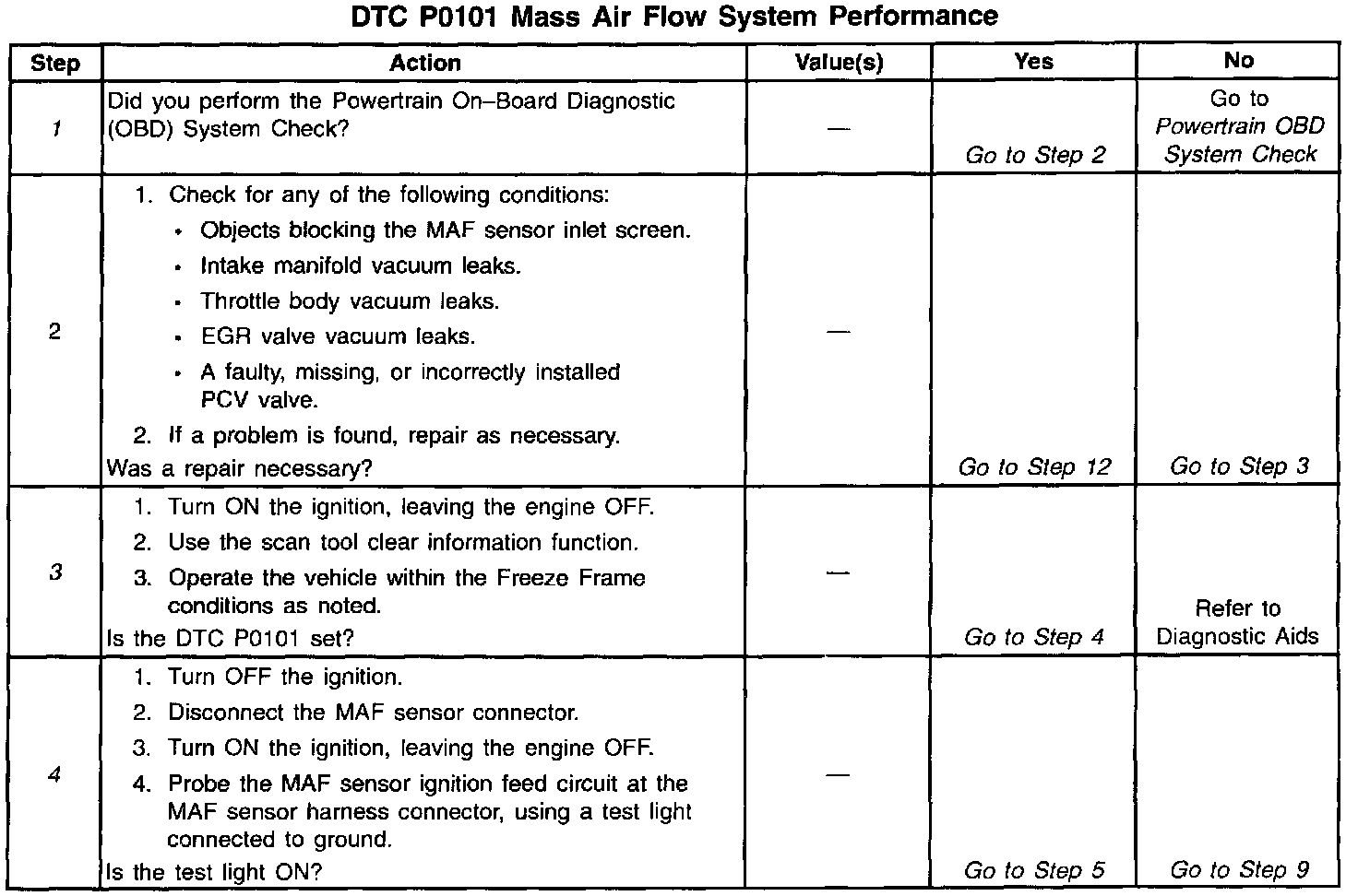 If the DTC P0101 cannot be duplicated, the information included in the Freeze Frame data can be useful in determining vehicle operating conditions when the DTC was first set.