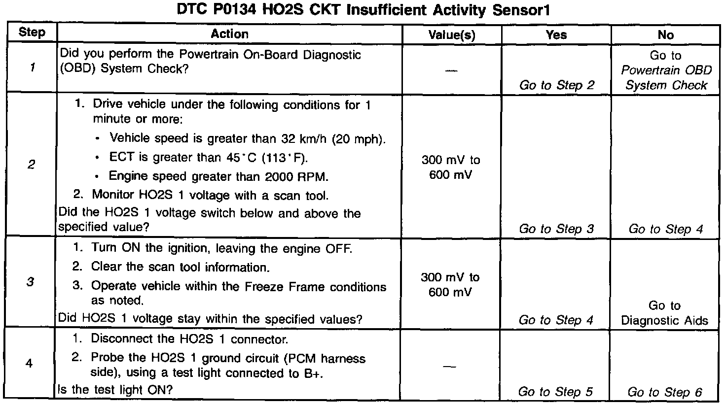 The Heated Oxygen Sensor (HO2S) produces a voltage that varies between 100 mV and 900 mV under normal operating conditions. The Powertrain Control Module (PCM) monitors this voltage and determines if the exhaust is lean or rich. If the voltage input at the PCM is about 100 mV the exhaust is lean, and if the voltage input is about 900 mV the exhaust is rich. The PCM constantly monitors the HO2S signal during closed loop operation and compensates for a rich or lean condition by decreasing or increasing fuel injector pulse width as necessary. If the HO2S 1 voltage remains at or near the 450 mV for an extended period of time, DTC P0134 will be set.