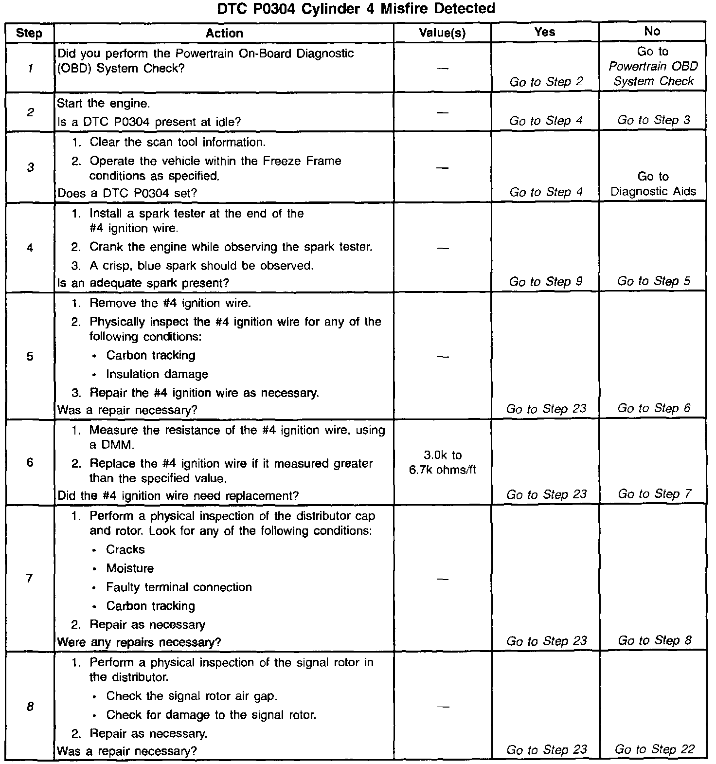 If a DTC P0304 cannot be duplicated, the information included in the Freeze Frame data can be useful in determining vehicle operating conditions when the DTC was first set. When the fault can not be duplicated, wet the secondary ignition system of the suspect cylinder with water and operate the vehicle under the conditions that the DTC set.