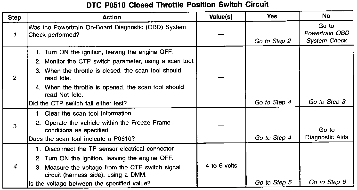 The Throttle Position (TP) sensor has a Closed Throttle Position (CTP) switch that sends a signal to the Powertrain Control Module (PCM). The PCM applies 5 volts to the CTP switch. The CTP switch is closed when the throttle valve is closed, and the CTP switch is open when the throttle valve is open. The PCM receives a low voltage signal from the CTP switch when the engine is idling, and receives a high voltage signal from the CTP switch when the engine is above idle.