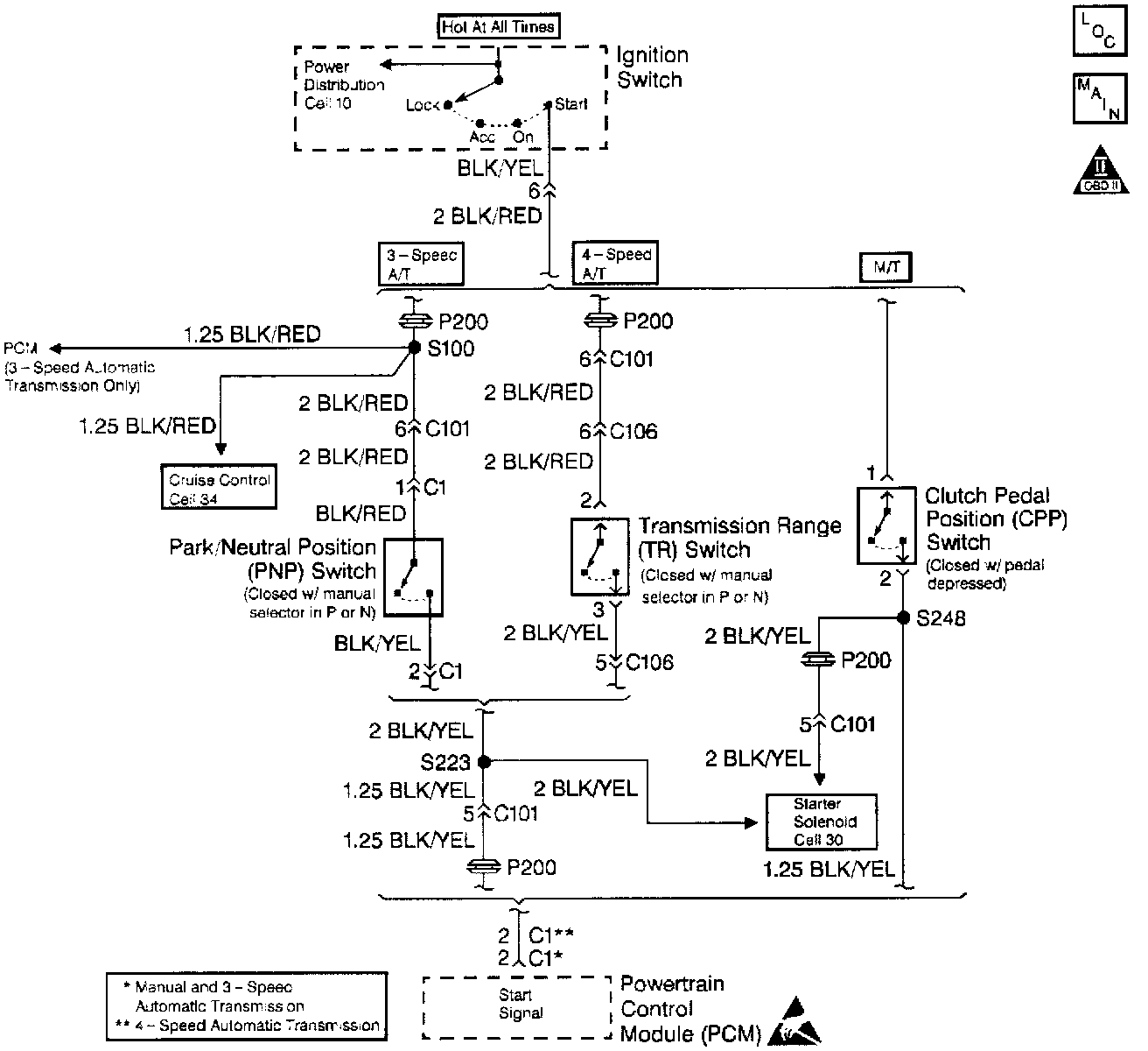 While the engine is being cranked, the battery voltage is applied to the Powertrain Control Module (PCM). The starter signal is mainly used to increase the fuel injection volume for the starting injection control. This signal is sent from the transmission range switch (automatic transmission) or the Clutch Pedal Position (CPP) switch. If this signal is not detected during ignition, the PCM will still allow the engine to start.