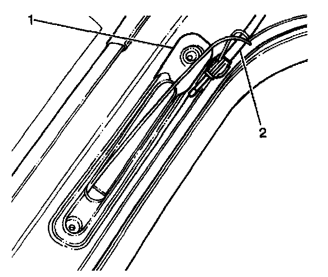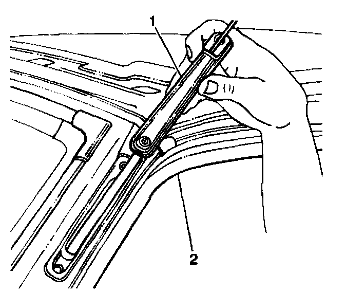 4. Remove the antenna mast from the vehicle by guiding the mechanics wire attached to the antenna cable (2) through the windshield side pillar (1).