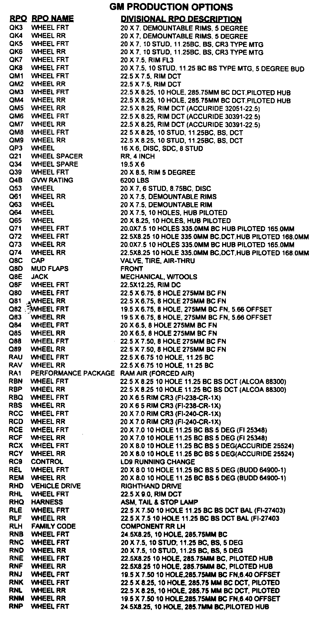 List of Regular Production Option (RPO) Codes