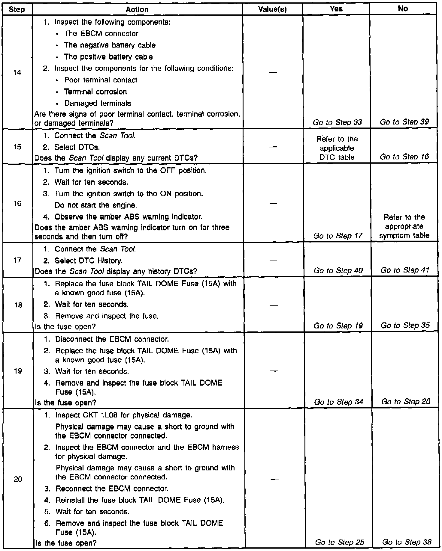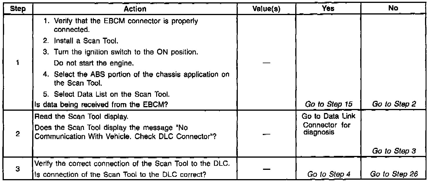 If communication with the EBCM is not possible with a scan tool, ensure these circuits are in good condition and that there is no excessive resistance. Also check EBCM connectors C1 and C2 for poor connector terminal contact.