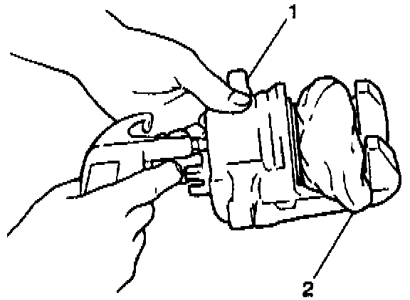 2. Insert a block of hard wood or a shop cloth (2) into the caliper interior (1) to catch the piston as it is forced out of the bore with compressed air.