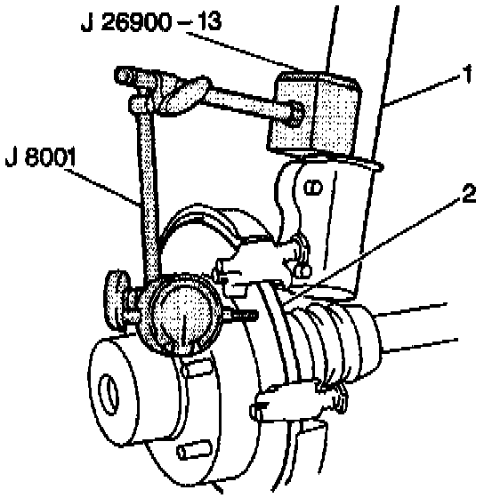 5. Fasten a J26900-13 and a J8001 to the strut (1) so that the indicator button contacts the brake rotor (2) about 10 mm (0.39 in) from the rotor edge.