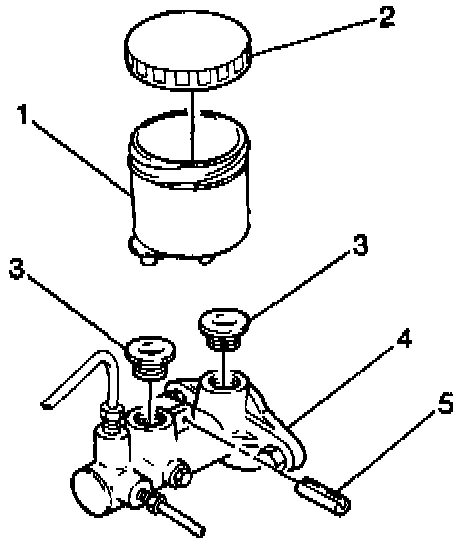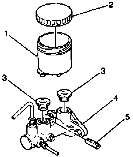 3. Remove the reservoir (1) and grommets (3) from the master cylinder (4).