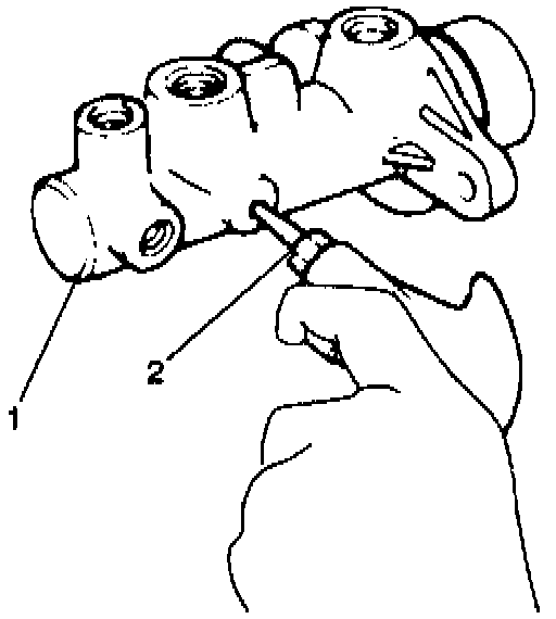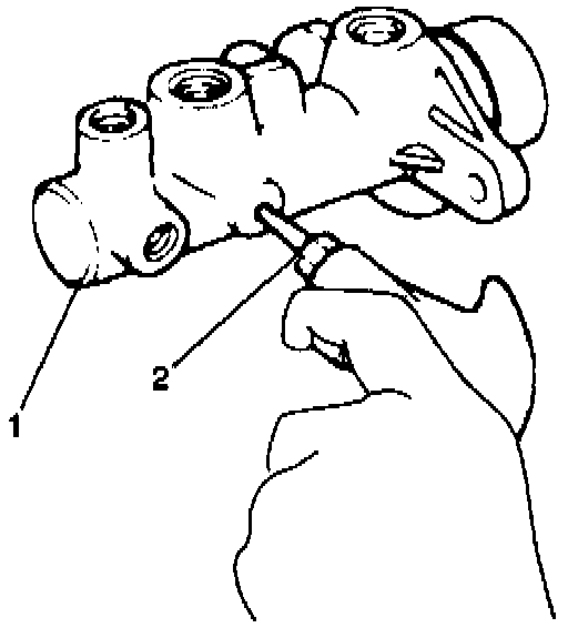 6. Remove the piston stopper bolt (2) and washer from the master cylinder (1).