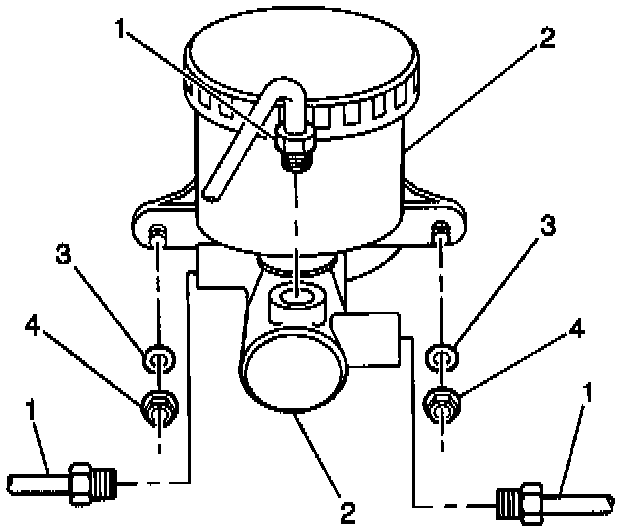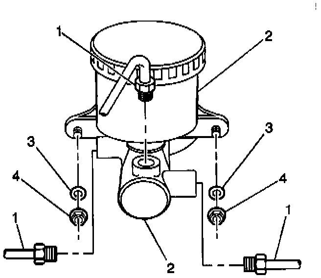 2. Install the master cylinder (2) and the new gasket to the vacuum booster. Secure with two mounting nuts and washers.