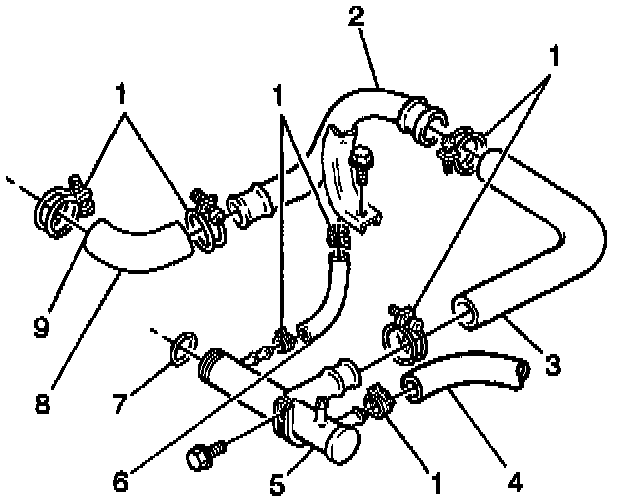 1. Position a new hose clamp (1) on each end of the coolant bypass hose.