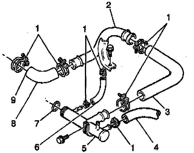3. Install the radiator hoses #1 (8) and #2 (3) to the radiator outlet pipe (2).