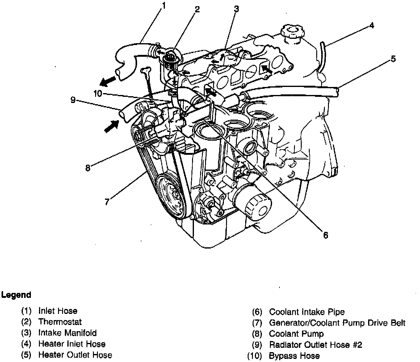 A lightweight tube and fin aluminum radiator is used in this vehicle. The air circulating between the tubes is directed by the fins to lower the engine coolant temperature (ECT) as it flows through the tubes.