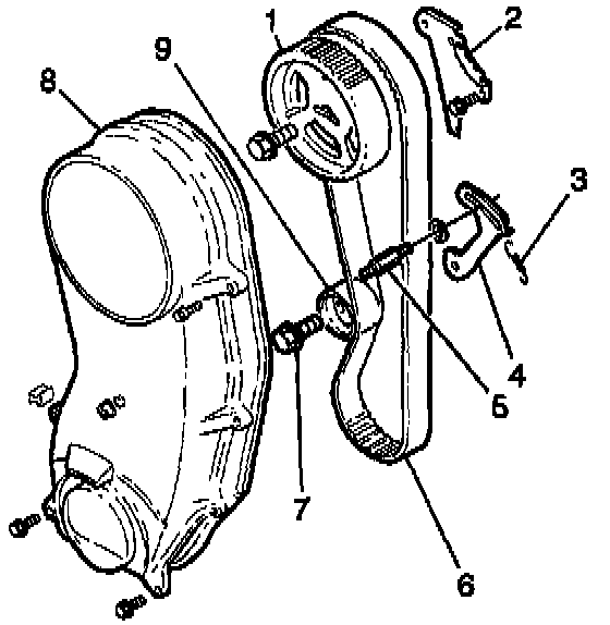 1. Inspect the timing belt (6) for wear or cracking. Replace the belt if necessary.