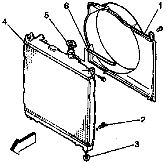 5. Remove the four bolts that secure the shroud (1) to the radiator (4).