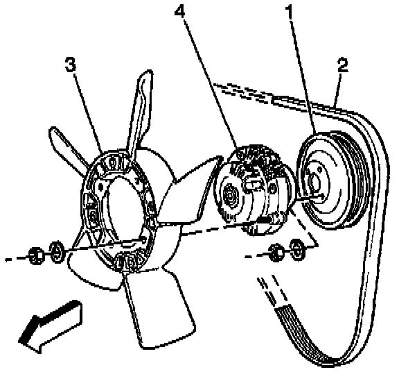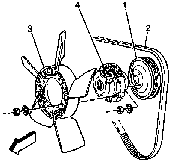 7. Remove the shroud, the fan clutch (4), and the cooling fan (3) together.