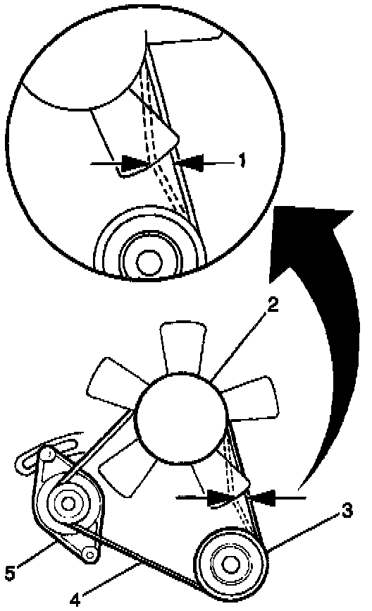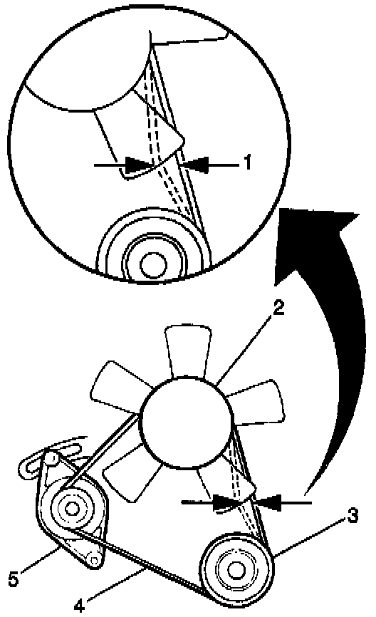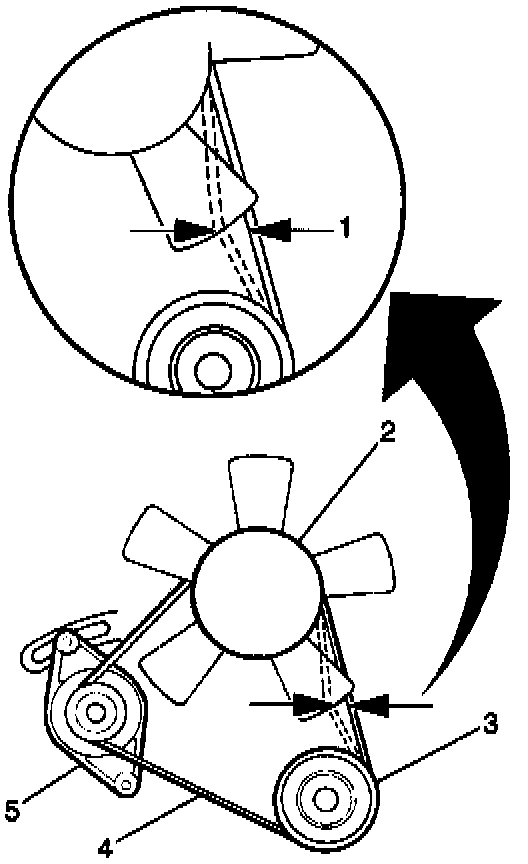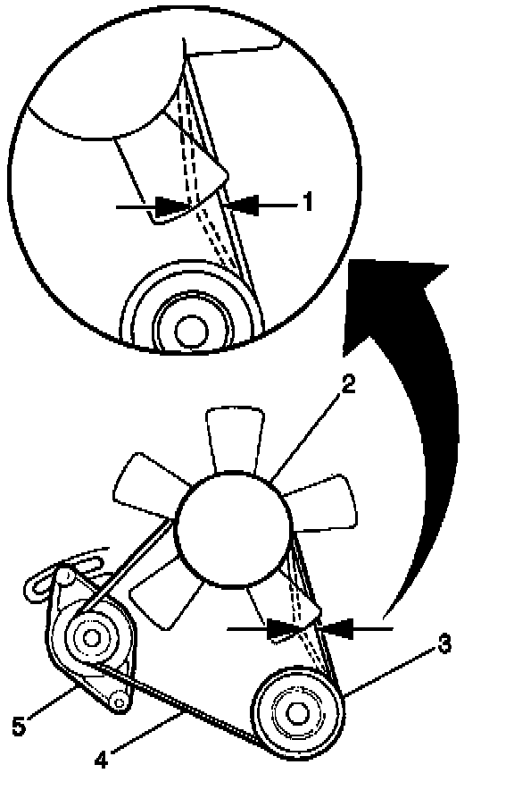 13. Adjust the generator/coolant pump drive belt tension (1) so that the belt deflects 5 to 8 mm (0.02 to 0.32 in) under 10 kg (22 lbs.) of applied pressure.