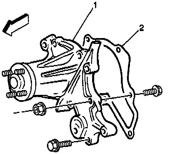 1. Install the coolant pump (1) with a new gasket (2) to the engine. Secure the pump with five bolts.