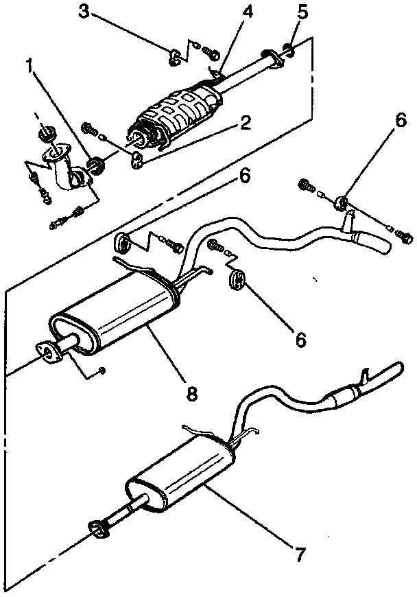 2. Install the two bolts and the two nuts securing the TWC to the muffler/tail pipe assembly. Finger tighten the nuts.