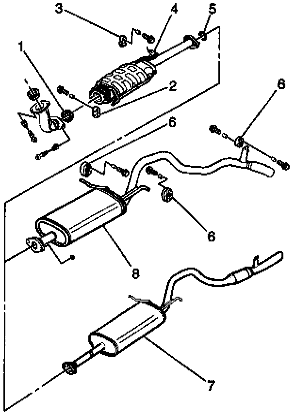 1. Connect the muffler/tail pipe assembly (8-2 door), (7-4 door) to vehicle. Secure the tail pipe with two hangers (6) (one bolt each). Finger tighten the bolt.