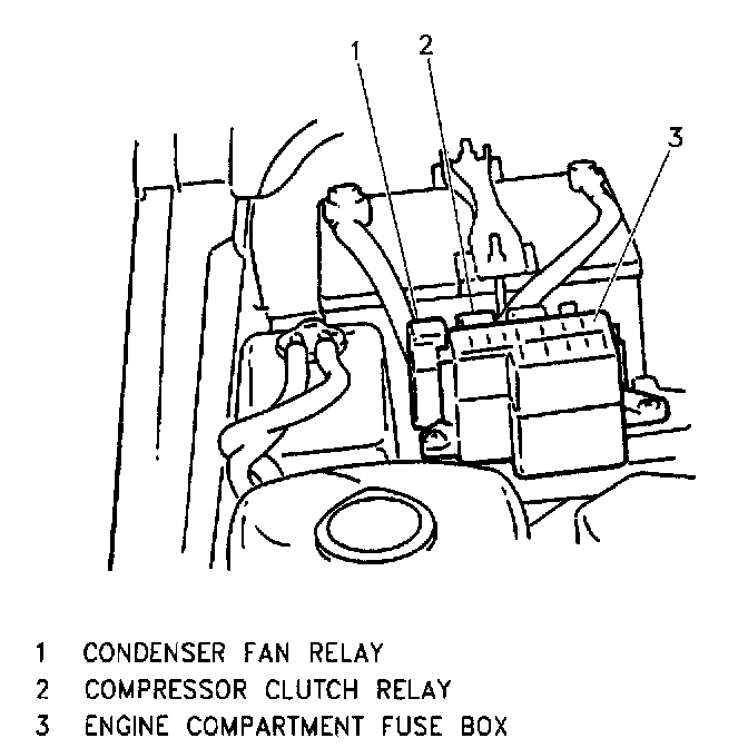 The following procedure applies to both the A/C compressor clutch relay and the A/C condenser fan relay. They are located between the battery and the fuse box in the engine compartment.