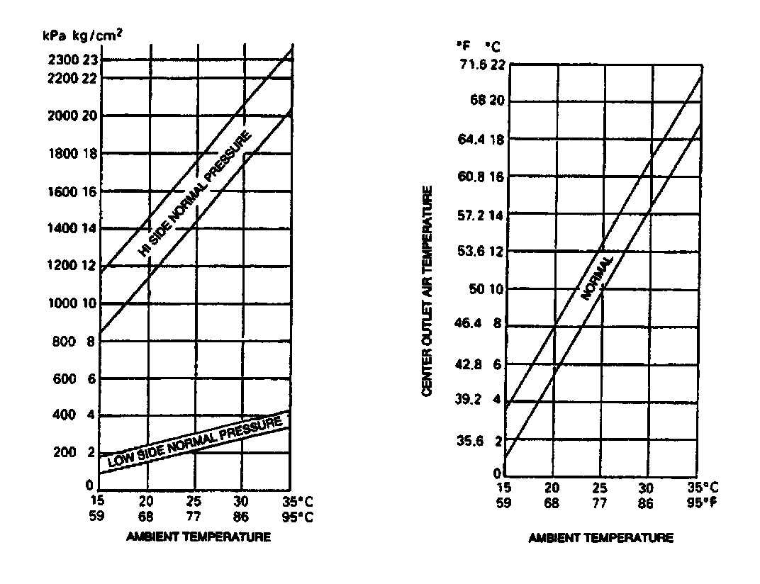 Compare recorded Hi and Low refrigerant system pressures and outlet air temperature with the graphs in Figure 3. If recorded values are not within specifications, refer to A/C System Refrigerant Diagnosis table for further diagnosis.