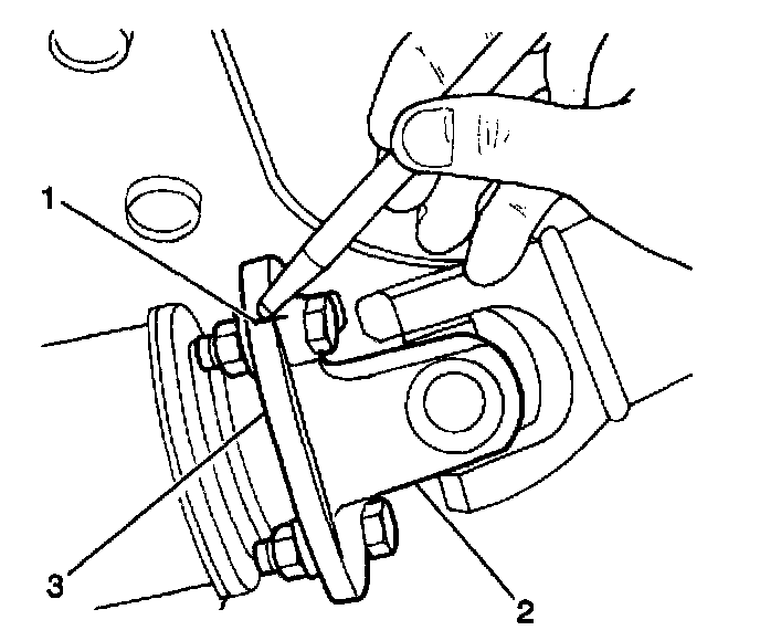2. Place an index mark (reference mark) (1) on the propeller shaft pinion flange and the front differential pinion flange of the transfer case to front differential propeller shaft (four-wheel drive models).