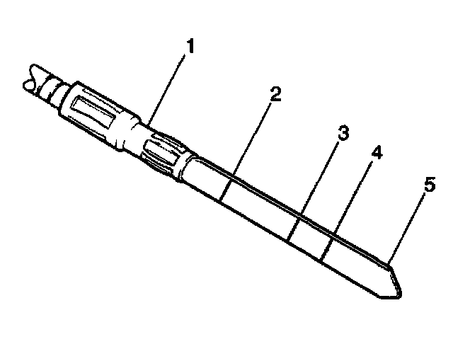 10.11. Remove the indicator and check the fluid level. The level should be between the FULL HOT (2) and the LOW HOT (3) marks. If the level is below the LOW HOT mark, add fluid to bring the level to the FULL HOT mark. Bringing the fluid level from the LOW HOT mark to the FULL HOT mark requires 0.3 liters (0.3 quarts) of fluid. Use Dexron III automatic transmission fluid GM P/N 12346143, or the equivalent.