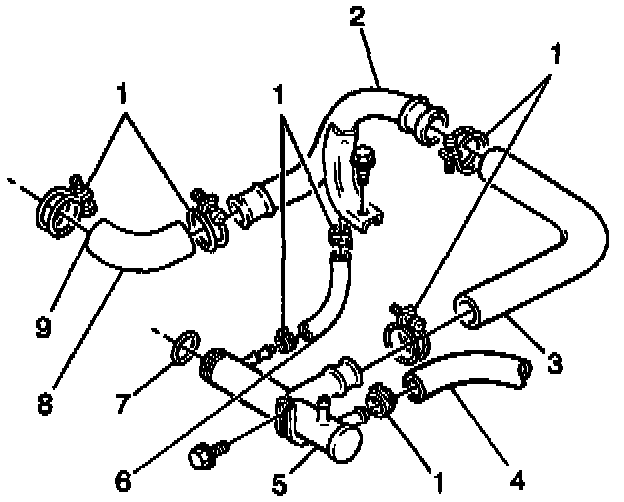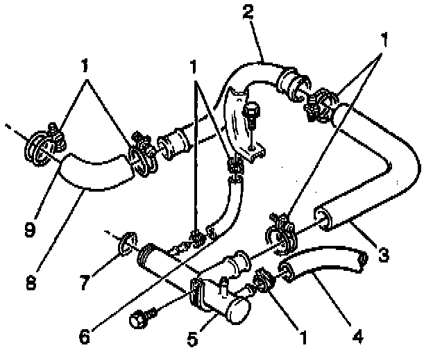 2. Install the new radiator outlet hose #1 (8) to the outlet pipe (2) and to the radiator.