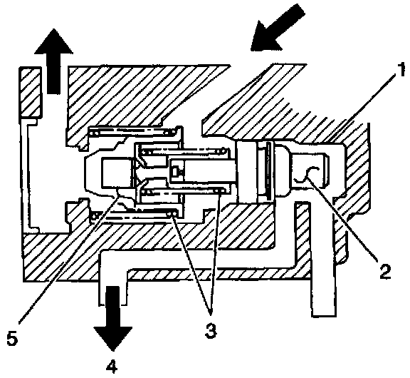 The fast idle air valve consists of a thermo-wax pellet (2), springs (4) and a valve (5) and is located in the throttle body (1). When the engine is cold (Engine Coolant Temperature [ECT] sensor is lower than 70° C [158° F]), the thermo-wax pellet contracts. In this state, the valve opens by the spring force, allowing the air to be drawn into the intake manifold (4). The amount of air drawn into the intake manifold will increase even though the throttle valve remains at the idle position The engine speed will rise to the fast idle state which is higher than the idle speed.