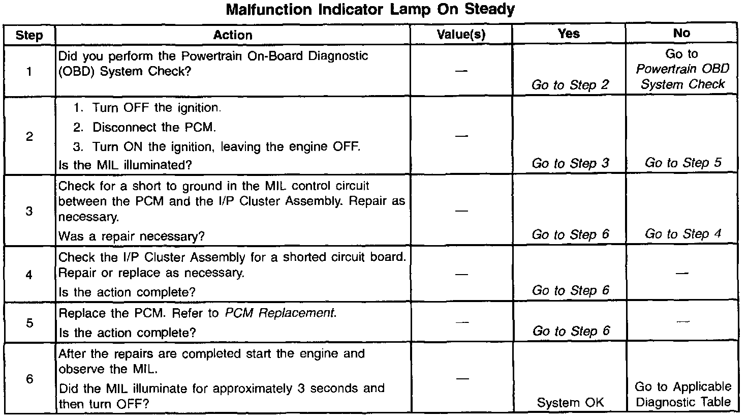 There should be a steady MIL when the ignition is ON, prior to starting the engine. Battery ignition voltage is supplied to the MIL. The PCM will turn the MIL ON by grounding the control circuit at the PCM. A steady MIL with the engine running suggests a short to ground in the MIL control circuit or a stored DTC.