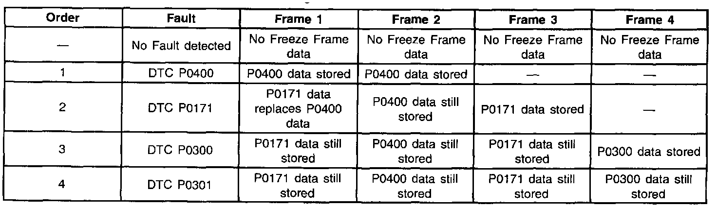 The PCM can store up to 4 frames of Freeze Frame data. The 1st frame stores data of the fault that was detected first. The data from the 1st detected fault is also stored in the 2nd frame of Freeze Frame data. The data stored in the 2nd frame of Freeze Frame data is permanent, and will not change when a new fault is detected. The 1st frame of Freeze Frame data will remain unchanged unless a fault of a higher priority occurs. A misfire fault (DTC P0300-P0304) or a fuel trim fault (DTC P0171 and P0172) will replace the data in the 1st frame of Freeze Frame data because these DTCs have a higher priority under OBD 2 rules. The 2nd through 4th frames of Freeze Frame data will store fault data in the order that the faults were detected regardless of the fault's priority. Utilizing the 4 frames of Freeze Frame data can provide information on the order in which the faults were first detected. The following table indicates how Freeze Frame data is stored when two or more faults are detected.