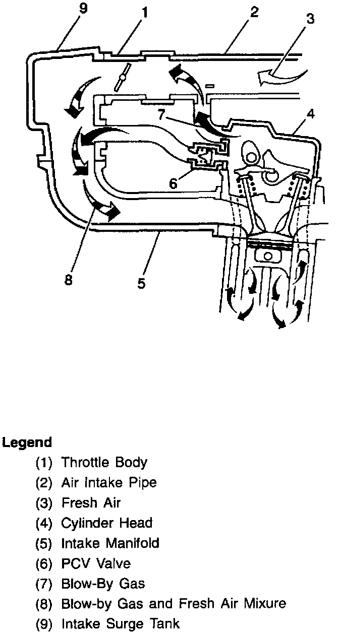The compressed combustion gas which escapes past the piston rings into the crankcase is known as blow-by gas. Blow-by gas contains large amounts of CO and HC. The PCV system prevents the blow-by gas from being emitted into the atmosphere. The PCV system consists of the PCV valve, the air intake (breather) hoses or couplers and the air inlet filter or separator (If used).