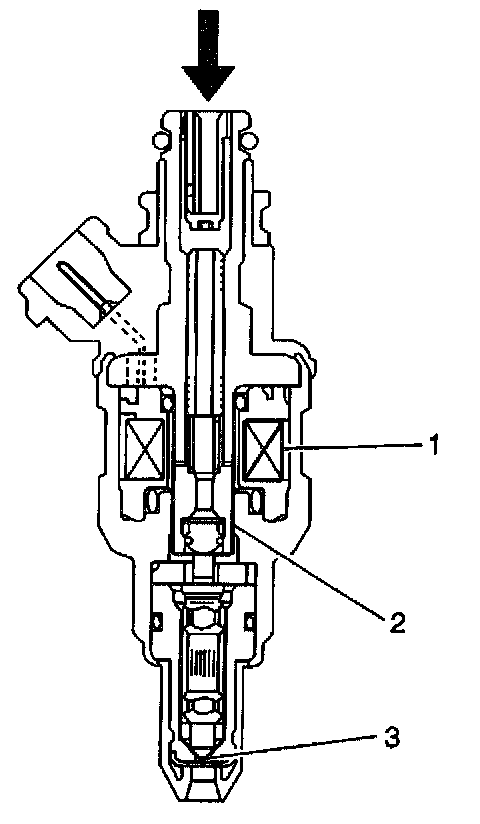 When the solenoid coil (1) of the fuel injector is energized by the PCM, it becomes an electromagnet and attracts the solenoid plunger (2). During this time, the needle valve (3), which is incorporated with the plunger, opens, and the fuel injector, which is under fuel pressure, injects the fuel. Because the stroke of the needle valve in the fuel injector is set constant, the amount of fuel injected at one time is determined by the length of time the solenoid coil is energized (pulse width injection time).