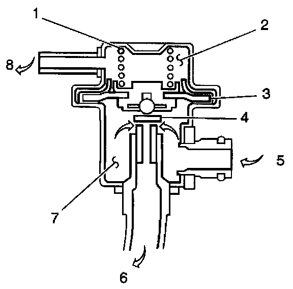The fuel pressure regulator is a diaphragm-operated pressure relief valve consisting of a diaphragm (3), a spring (1) and a valve (4). The fuel pressure regulator keeps the fuel pressure applied to the fuel injectors 290 kPa (41 psi) greater than the pressure in the intake manifold at all times.