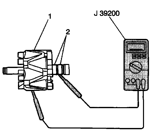 3. Measure the resistance between the rotor slip rings (2) and the rotor (1) using the J 39200. If the resistance is less than 5 ohms, replace the rotor.