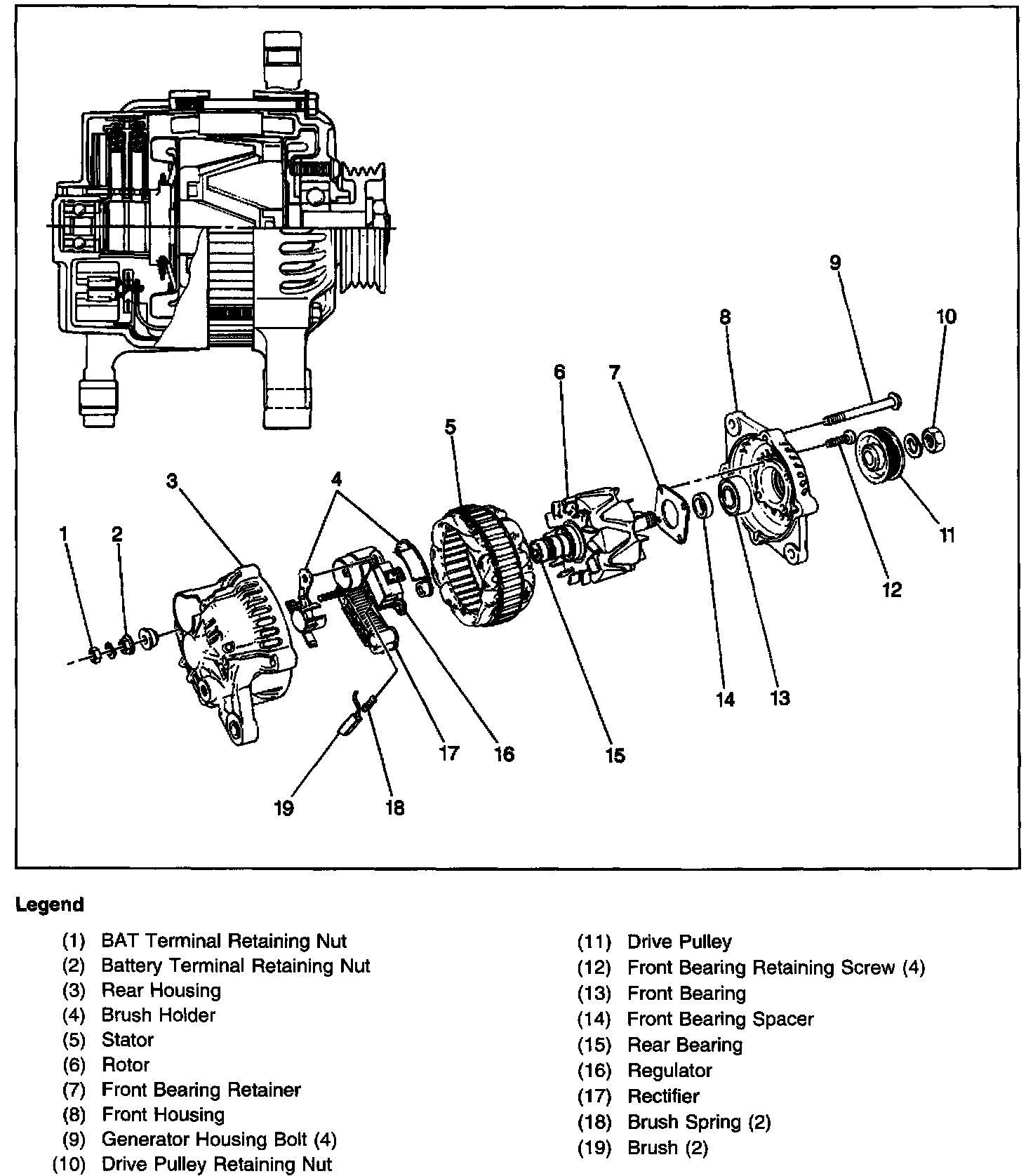 The generator rotor bearings contain enough grease to eliminate the need for periodic lubrication. Two brushes carry current through two slip rings to the field coil mounted on the rotor. Stator windings are assembled inside a laminated core that form part of the generator drive end frame. A rectifier bridge that contains 6 diodes is connected to stator windings. These diodes electrically change stator AC voltage into DC voltage. This DC voltage is then transmitted to the generator output terminal. Two neutral diodes are utilized to smooth out voltage fluctuations caused by varying generator speeds. A capacitor (condenser), mounted in the regulator, protects the rectifier bridge and neutral diodes. This capacitor also suppresses radio interference noise.