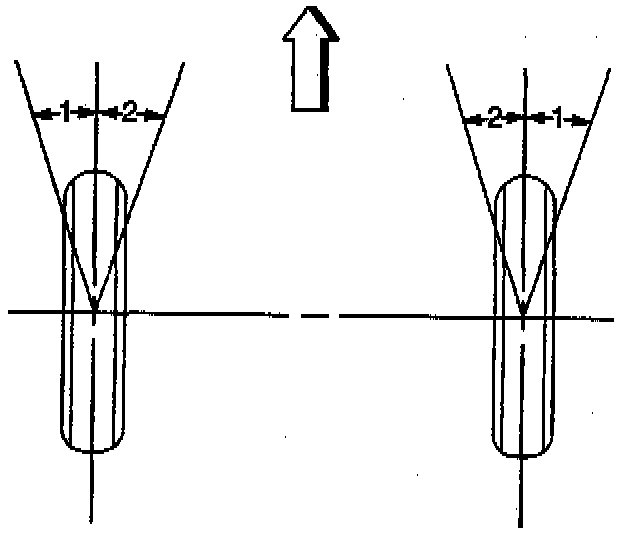 ^ The toe is positive (+) when the wheels turn inward (toe-inch) (2).