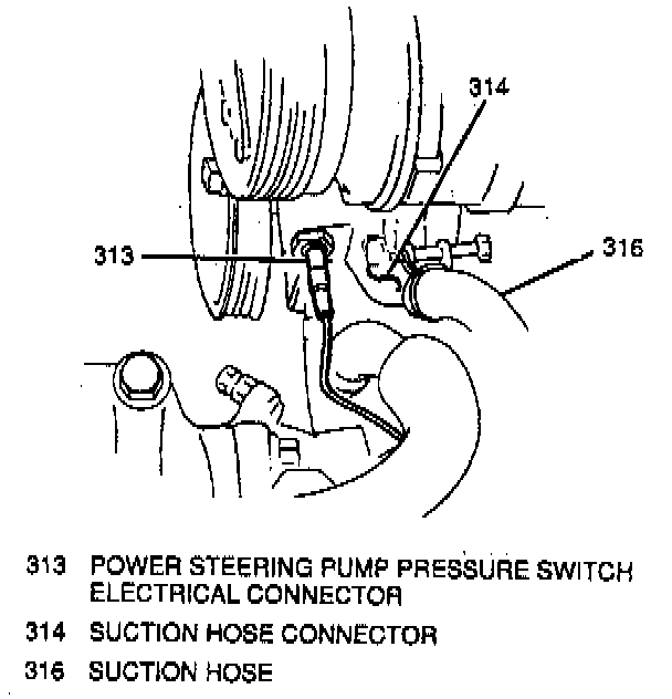 6. Suction hose from power steering pump by loosening one hose clamp.