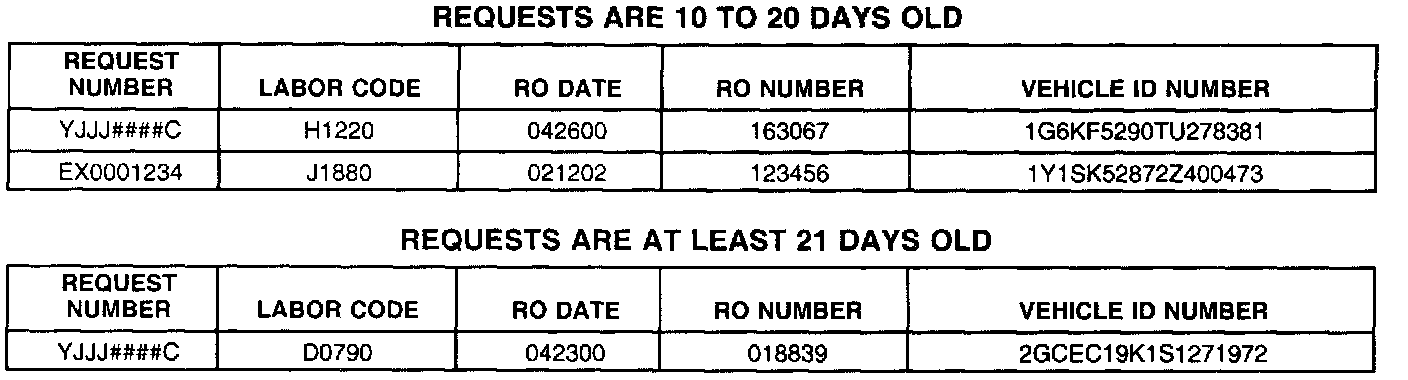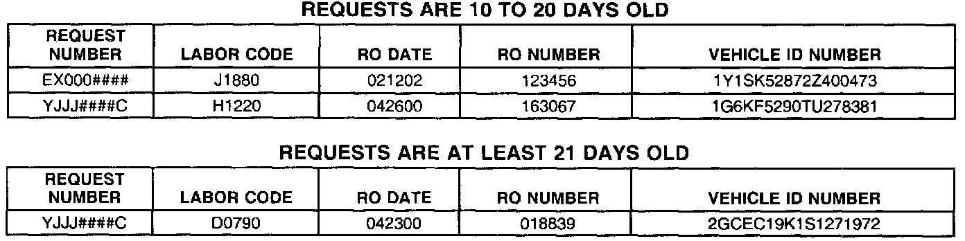 Shown are R.O. Only requests which should be returned to the requestor via the post office using the mailing label provided. No R.O. Only requests should be returned to the Warranty Parts Center.