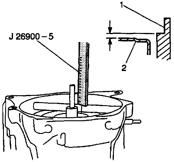 5. Measure the height difference between the forward clutch (2) input shaft and the transmission case (1) using the J26900-5.