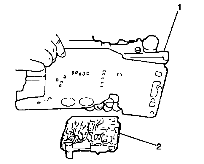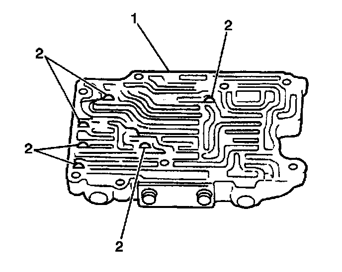 6. Inspect the rear upper valve body (1) for the proper locations of the check balls (2).