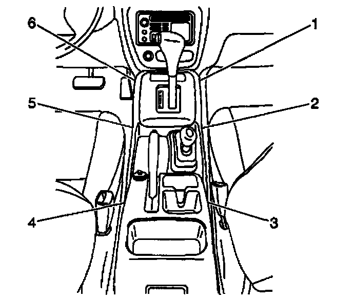 3. Remove the center console screws (1,6) and the clips (2,5).